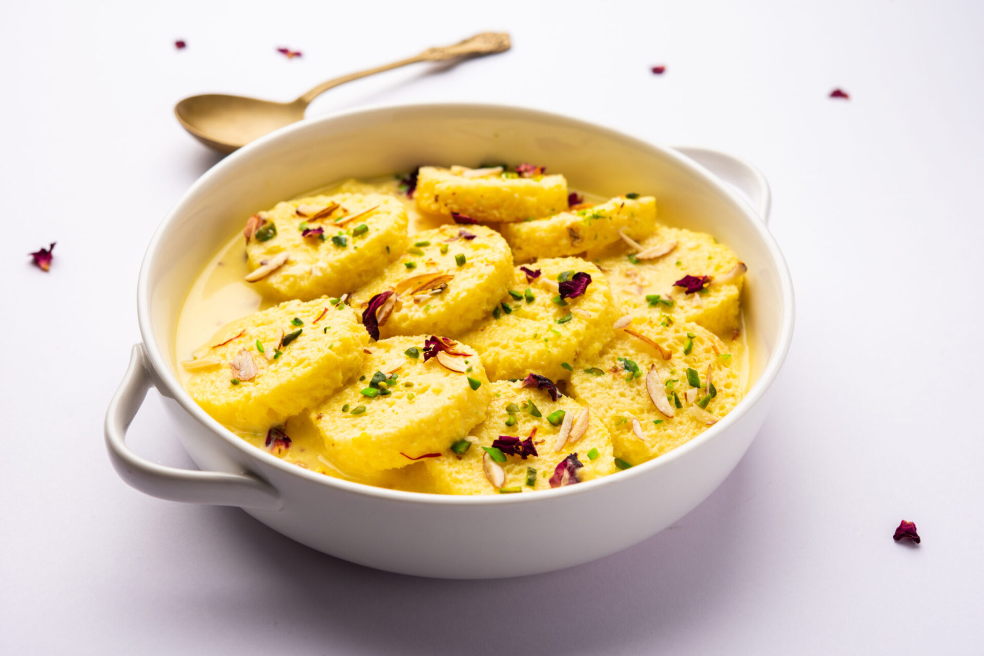 Light, creamy Rasmalai soaked in sweet, aromatic milk with saffron.